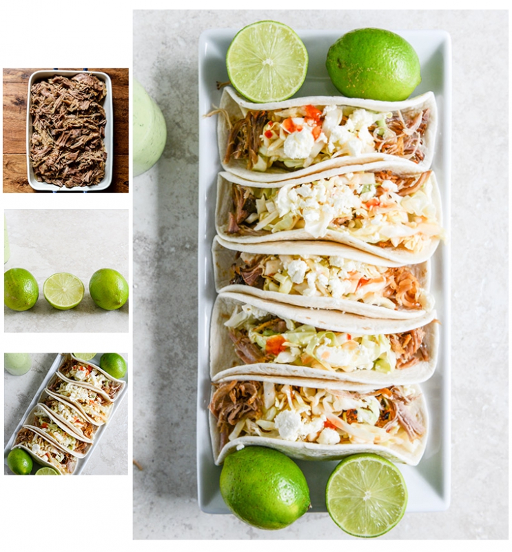 Assemble the tacos by adding some pork to each tortilla and covering it with a drizzle of the avocado cream. Add the slaw on top and crumble on a bit of cheese.